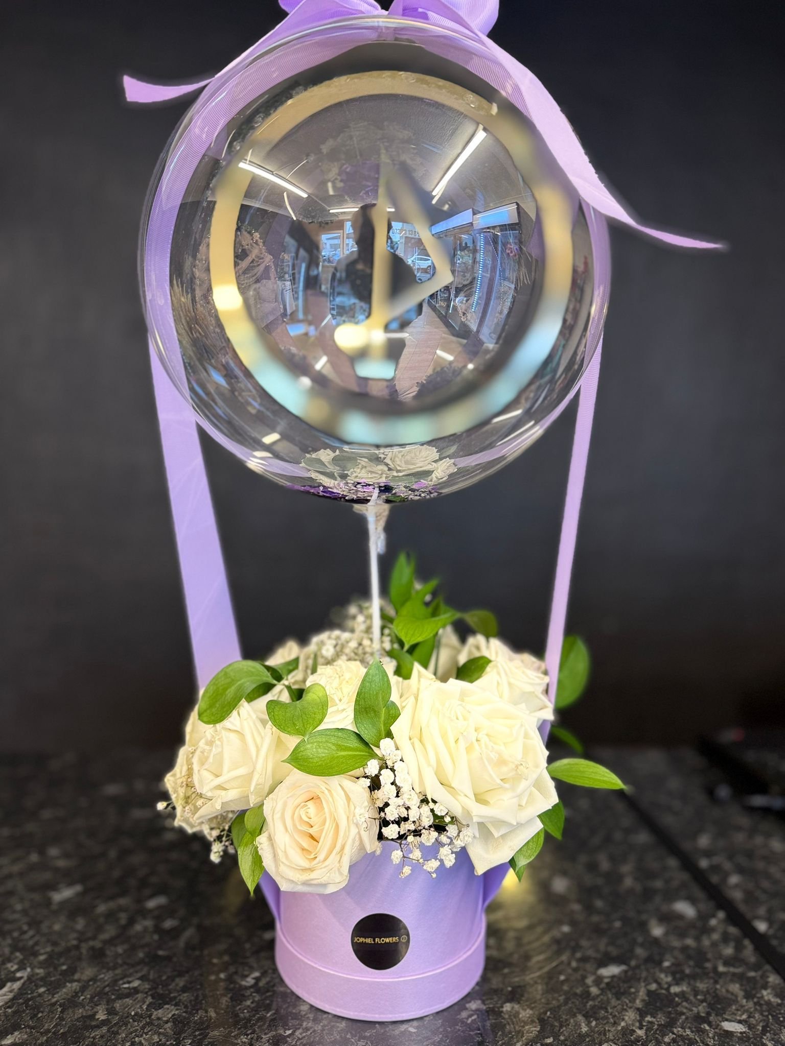 Un aranjament delicat și vesel, cu un balon moale de culoare liliac, asortat cu trandafiri albi proaspeți. Perfect pentru a exprima bucurie, dulceață și o notă de romantism. Ideal pentru zile de naștere, surprize speciale sau pur și simplu pentru a însenina ziua cuiva.