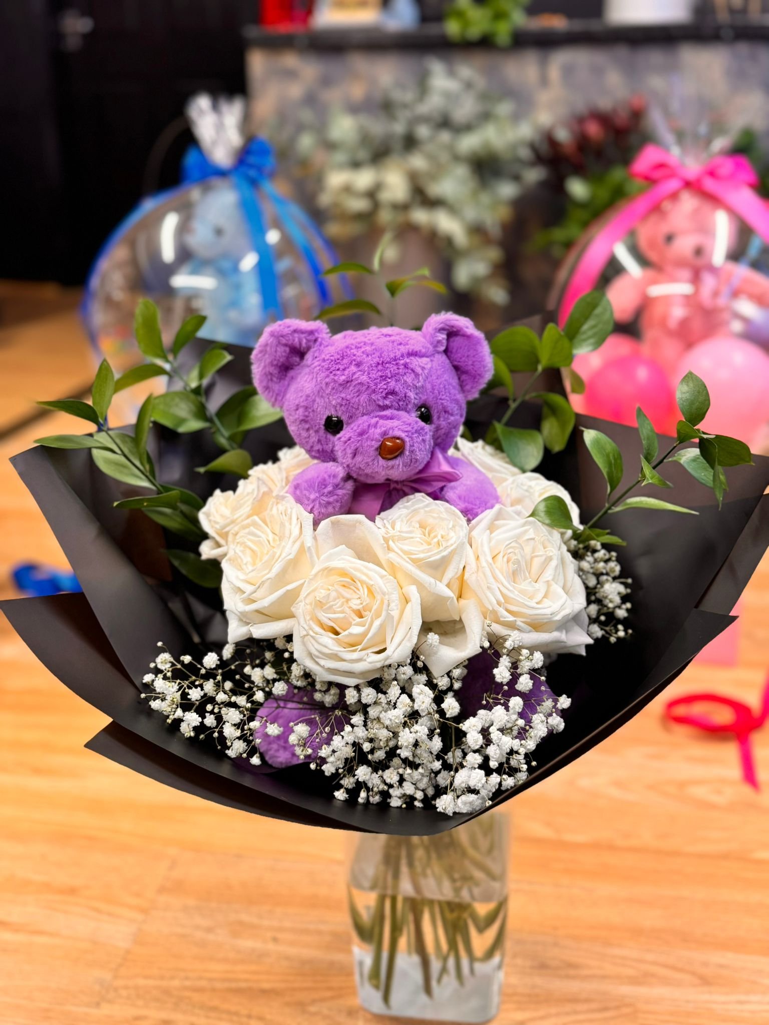 Impressed your loved one with our purple teddy bear bouquet. Ideal for birthdays, special surprises, or simply to brighten someone’s day. You can choose the color of the teddy bear and the type of flowers.